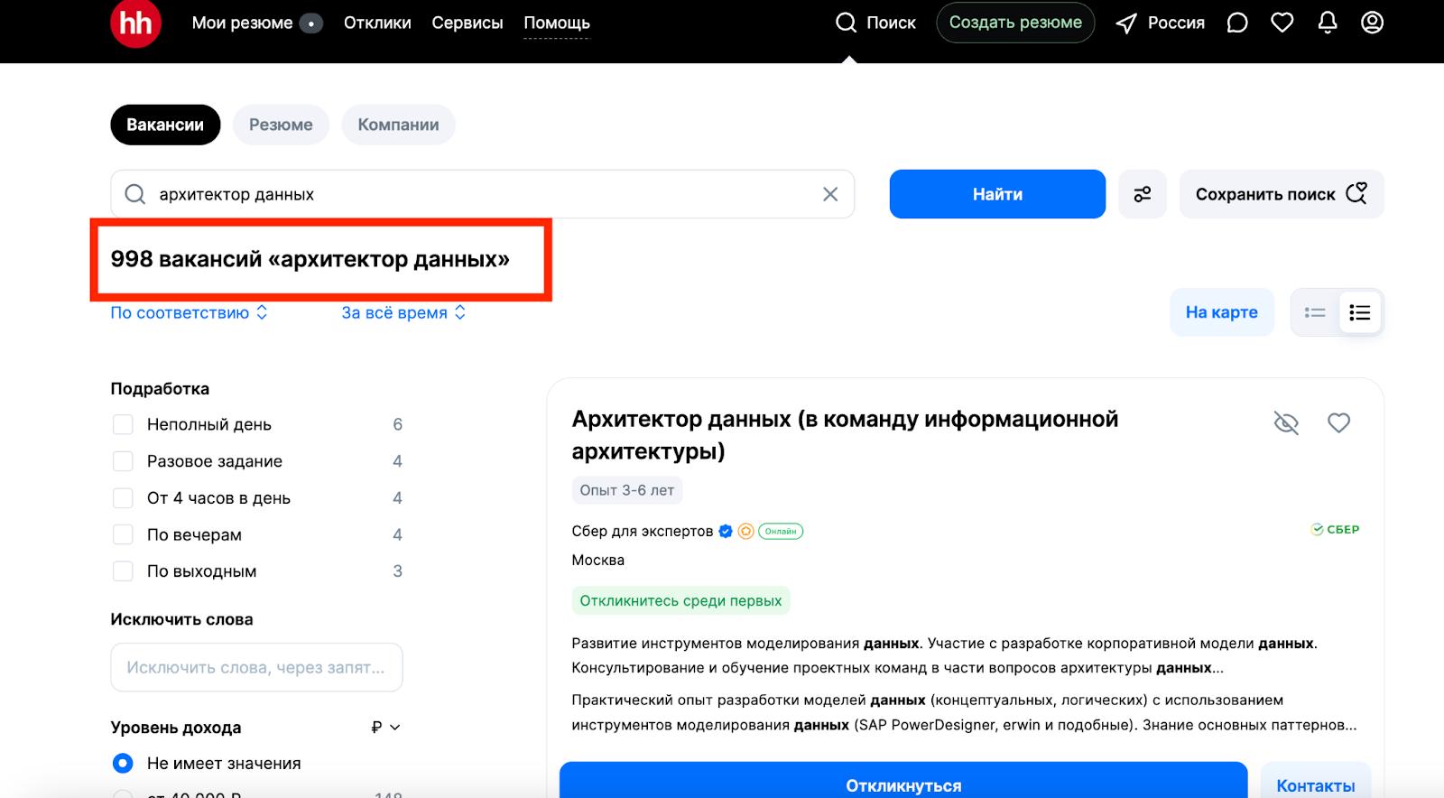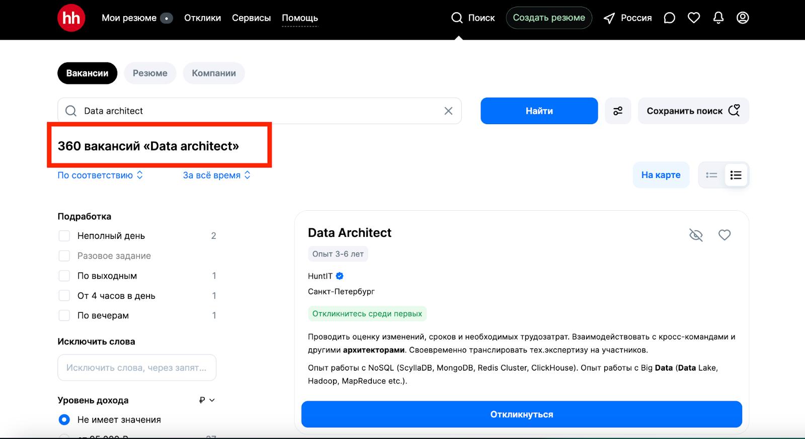 На поисковике HH.ru по запросам «Архитектор данных» и «Data arhitect» на сентябрь 2024 года можно найти почти 1400 вакансий.