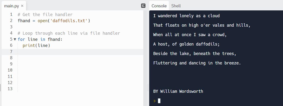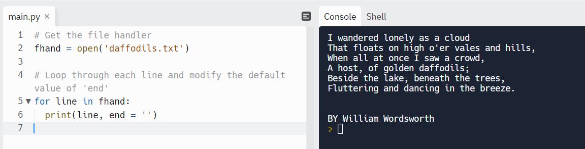 В этом примере мы откроем файл daffodils.txt. Обратите внимание, что этот файл должен находиться в той же папке, что и ваша программа на Python. Вы можете скачать файл daffodils.txt по этой ссылке на GitHub.