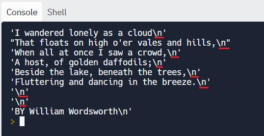 В конце каждой строки находится символ новой строки, который переводит вывод на следующую строку. Мы можем визуализировать это, используя метод repr().