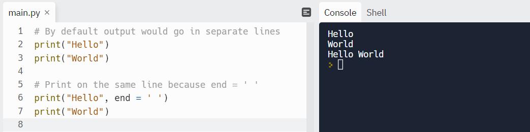 Мы можем изменить значение по умолчанию end='\n' на пробел, чтобы не получать новую строку в конце каждой строки. Посмотрим пример ниже, чтобы лучше понять это.