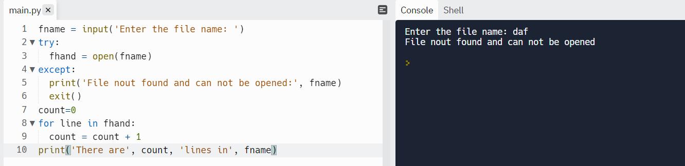 Попросим пользователя ввести имя файла. Затем мы подсчитаем количество строк в файле.