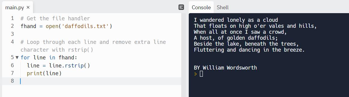 Теперь мы знаем, что по умолчанию каждая строка в файле заканчивается на \n. Поскольку нас интересует только символ справа, мы используем rstrip(), который означает "удаление справа". Рассмотрим пример использования rstrip() ниже.