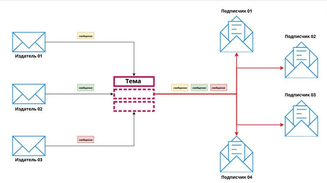 Основной компонент, который обеспечивает всю эту функциональность, называется Тема (Topic). Издатель отправляет сообщение в тему, а тема сразу же отправляет это сообщение всем подписчикам. Именно этот подход отличает модель Pub/Sub от обычных брокеров сообщений, где очередь сообщений группируется до тех пор, пока пользователь или служба не запросит и не извлечет их.