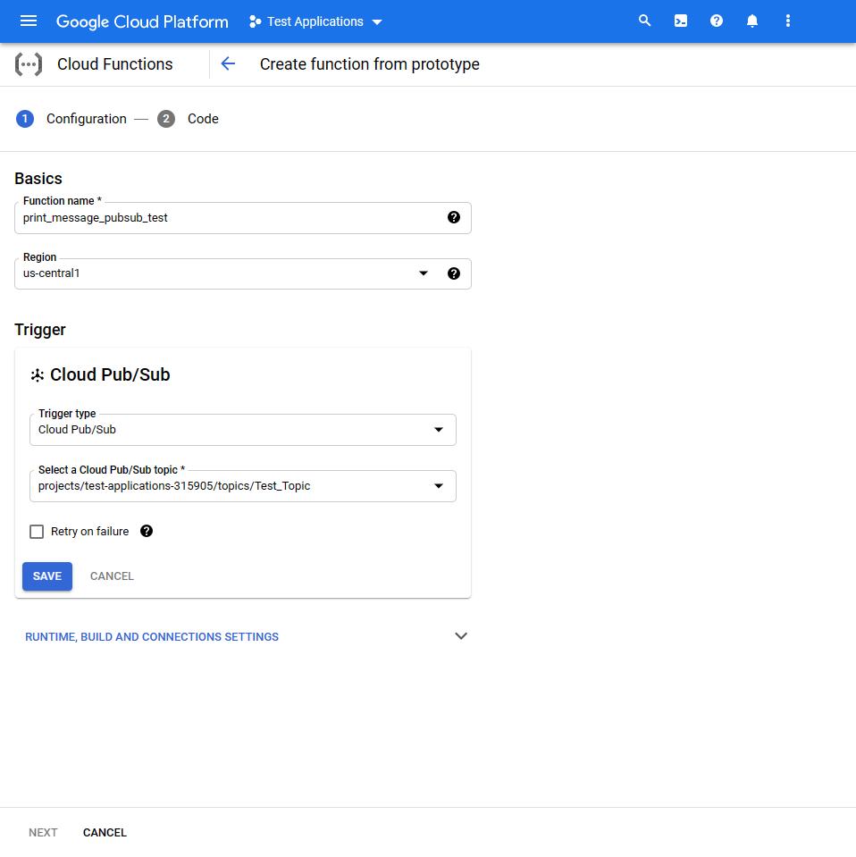 Шаг 3. Создание функции Google (print_message_pubsub_test)