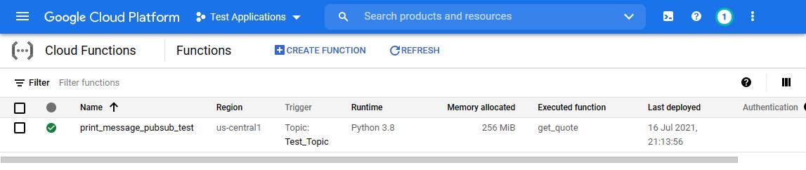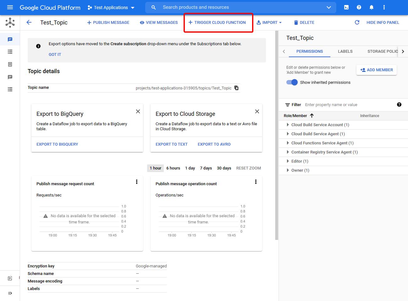 После того, как функция будет успешно развернута, вы увидите, что в качестве триггера функции будет указана тема Test_Topic.