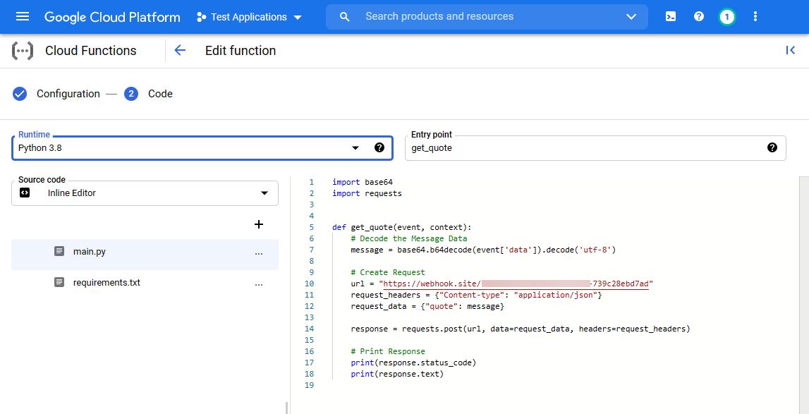 На первом экране вы можете дать функции название и настроить тему в качестве триггера. Для создания функции, которая будет просто собирать передаваемые данные и отправлять их на сайт Webhook, мы будем использовать Python.