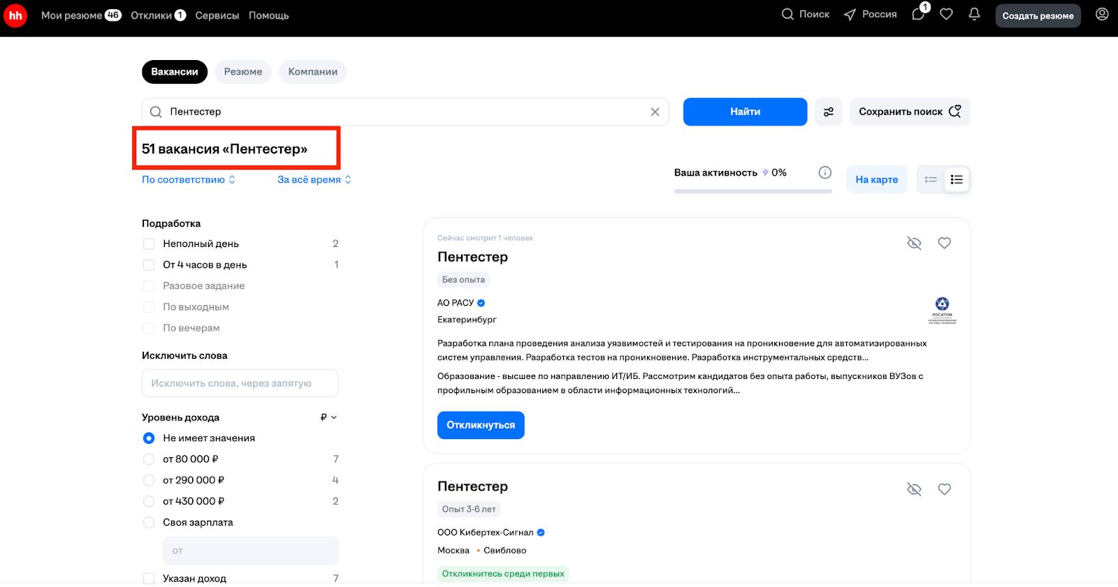 На hh.ru по запросу «Пентестер» в январе 2025 года можно найти 51 вакансию. Начинающие специалисты могут рассчитывать на зарплату от 80 000 рублей в месяц. Доход «белых» хакеров варьируется от 120 000 до 250 000 рублей в месяц.