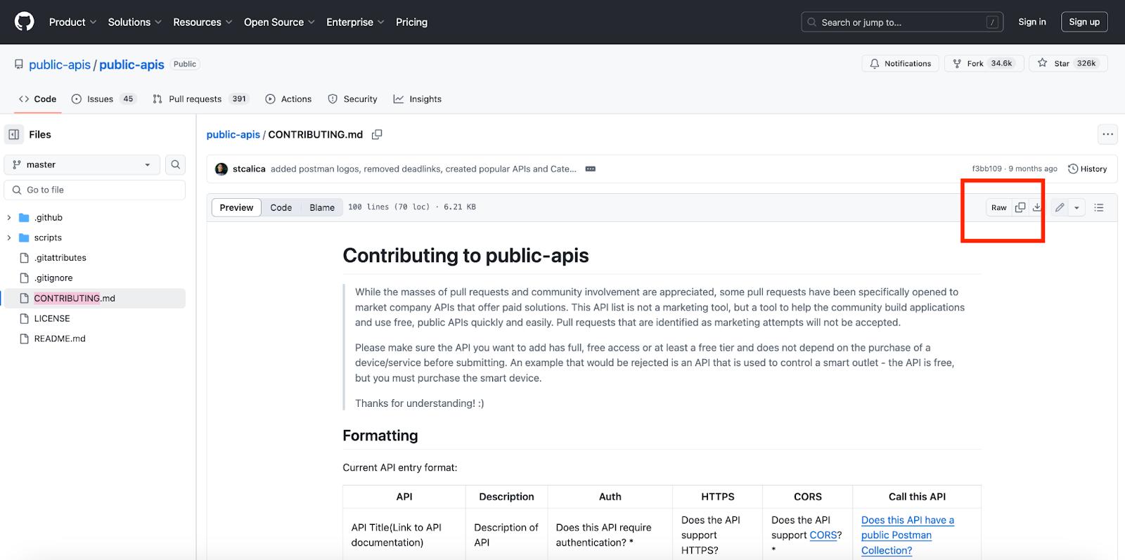 Шаг 2: На странице с содержимым файла нажмите кнопку «Raw» над кодом.