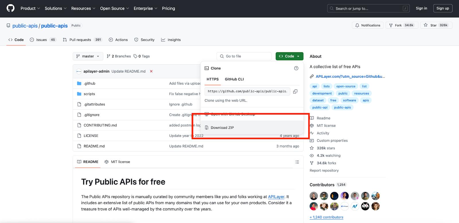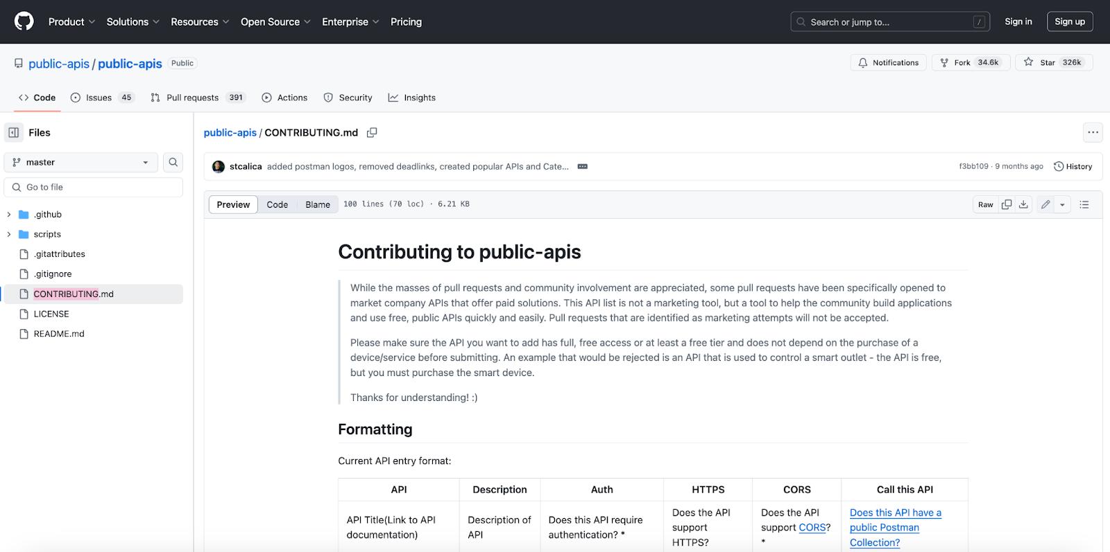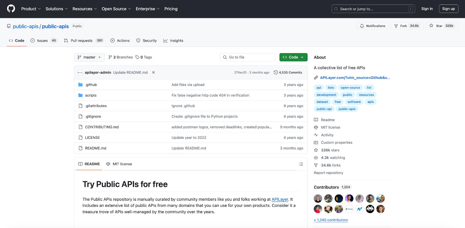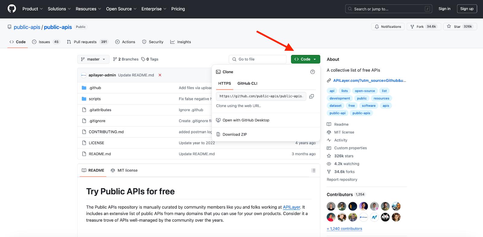 Шаг 1: Перейдите на главную страницу нужного репозитория на GitHub. Для примера мы взяли Public APIs, где хранится большой список бесплатных API.