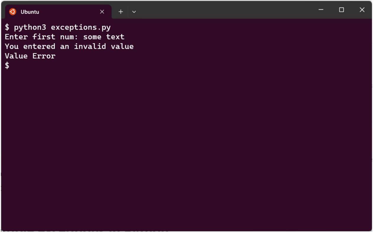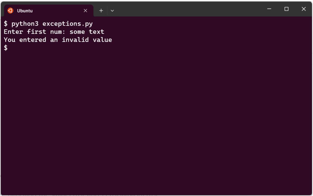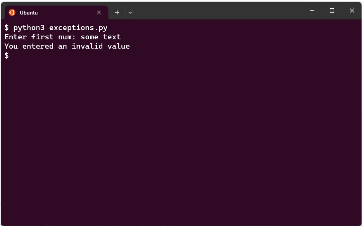 Если мы запустим этот код и введем текст, который нельзя преобразовать в целое число, то получим следующий результат: