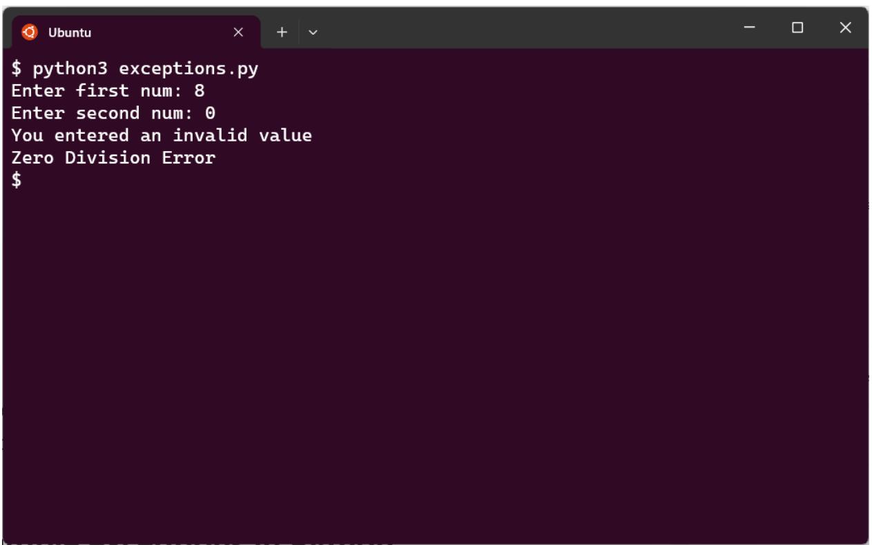 Приведенный выше код выполняет первый блок except, когда обнаружена ошибка ValueError или ZeroDivisionError. В некоторых случаях возможно такое, что вы хотите выполнить какой-то код для обеих ошибок и какой-то еще код только для одной из них.