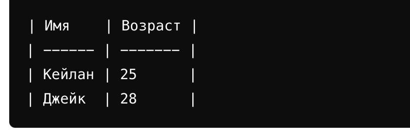 Таблица Markdown отображена с заголовками "Имя" и "Возраст", где указаны Кейлан, Джейк и их возраст — 25 и 28 соответственно.