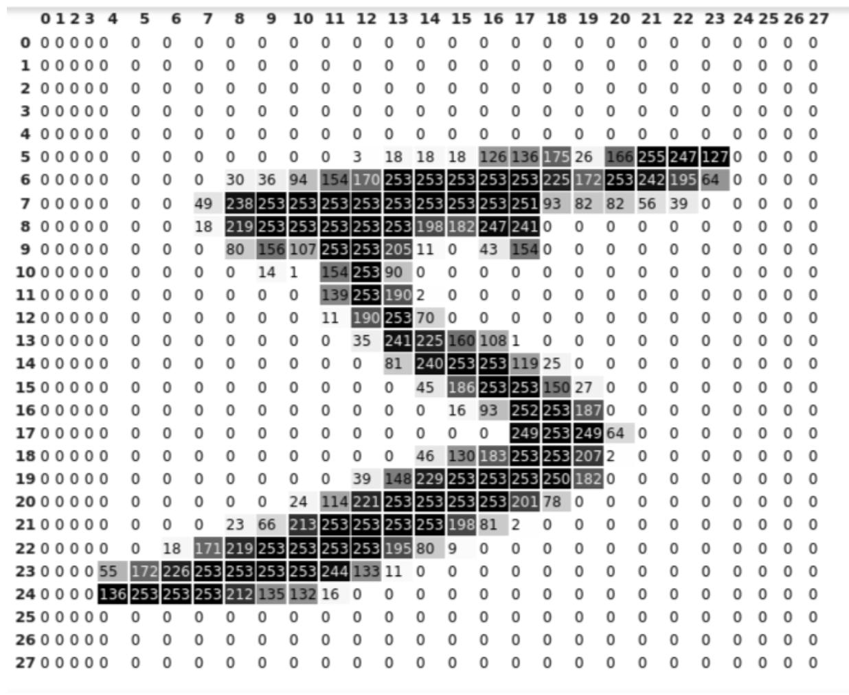 Как вы можете видеть выше, у нас 28 строк и 28 столбцов (индекс начинается с 0 и заканчивается на 27), как и в матрице. Нейронные сети видят только эти матрицы 28×28.