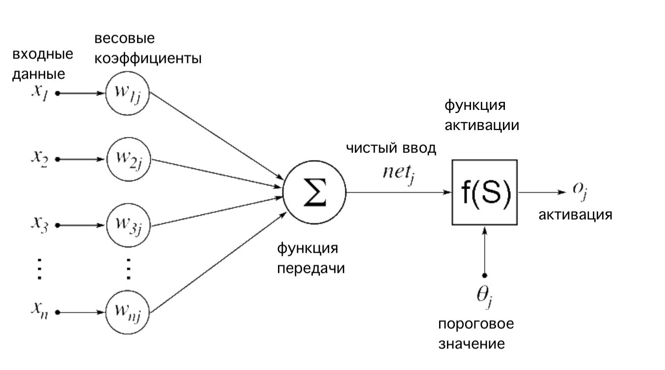 Значения признаков умножаются на соответствующие весовые коэффициенты, обозначаемые как w1j, w2j, w3j...wnj. Перемноженные значения суммируются и передаются на следующий слой.