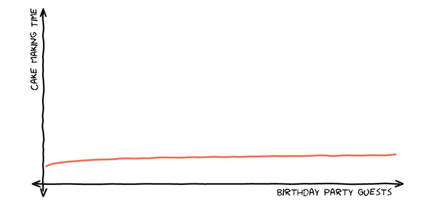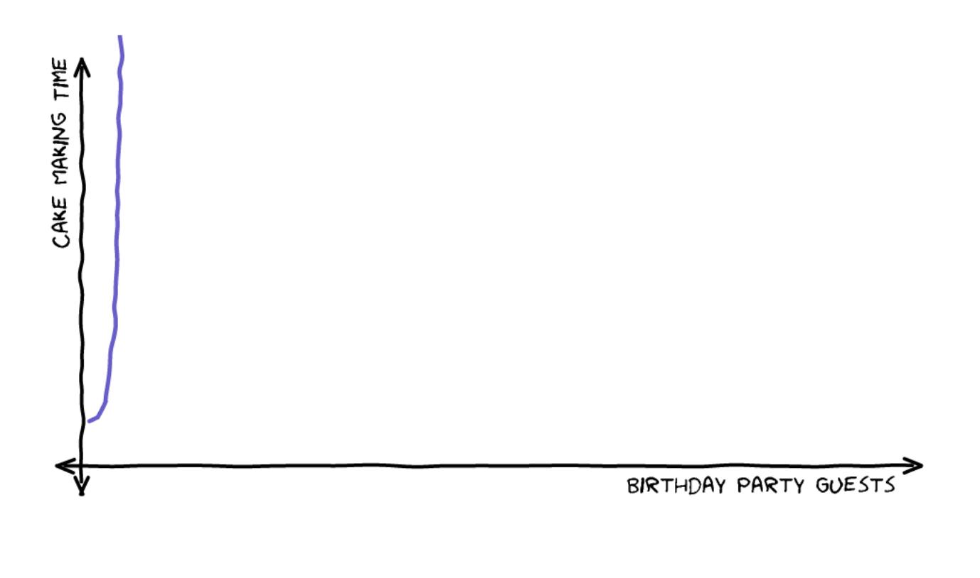 Опять же, в нотации Big O не указывается, как долго длится процесс (может быть, на приготовление торта уходит 1 час, а может быть, 4 часа), а просто говорится, что время линейно увеличивается с ростом числа гостей.