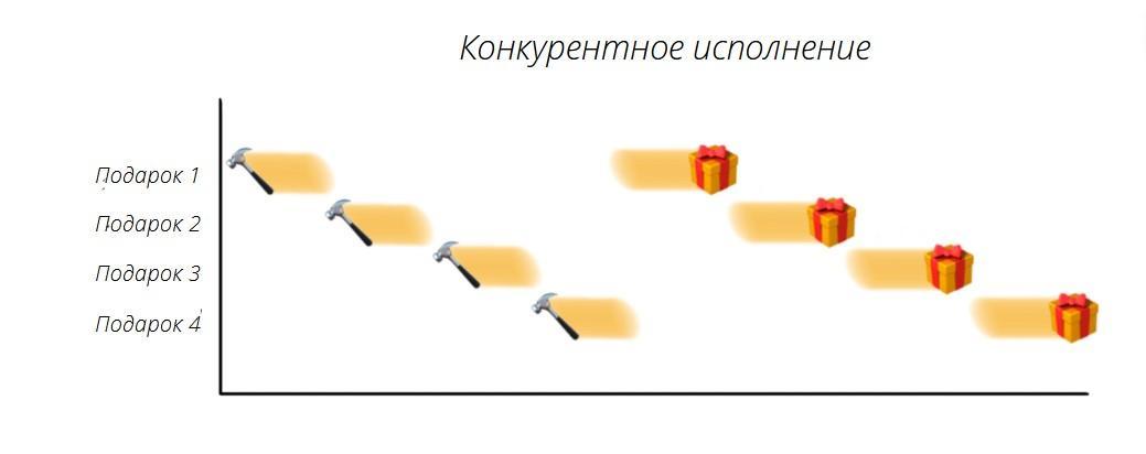 Почти два с половиной миллиона подарков в день – большая нагрузка для любой мастерской. Давайте рассмотрим два подхода, которые Санта может использовать, чтобы упаковать все подарки: конкурентное исполнение (конкурентность) и параллельное исполнение (параллелизм).