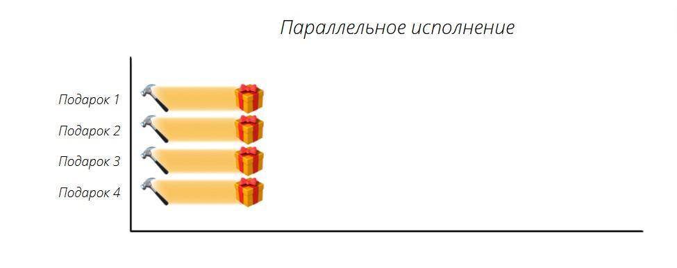 Когда эльф только один, то в любой момент времени он может выполнять лишь один этап для одного подарка. Если бы эльф производил по одному подарку от начала и до конца, то этот процесс был бы последовательным. Но это не самый эффективный способ для того, чтобы изготовить два с половиной миллиона подарков за день. Например, эльфу придется ждать и при этом ничего не делать, пока клей на игрушке не высохнет, и он сможет перейти к следующему этапу.