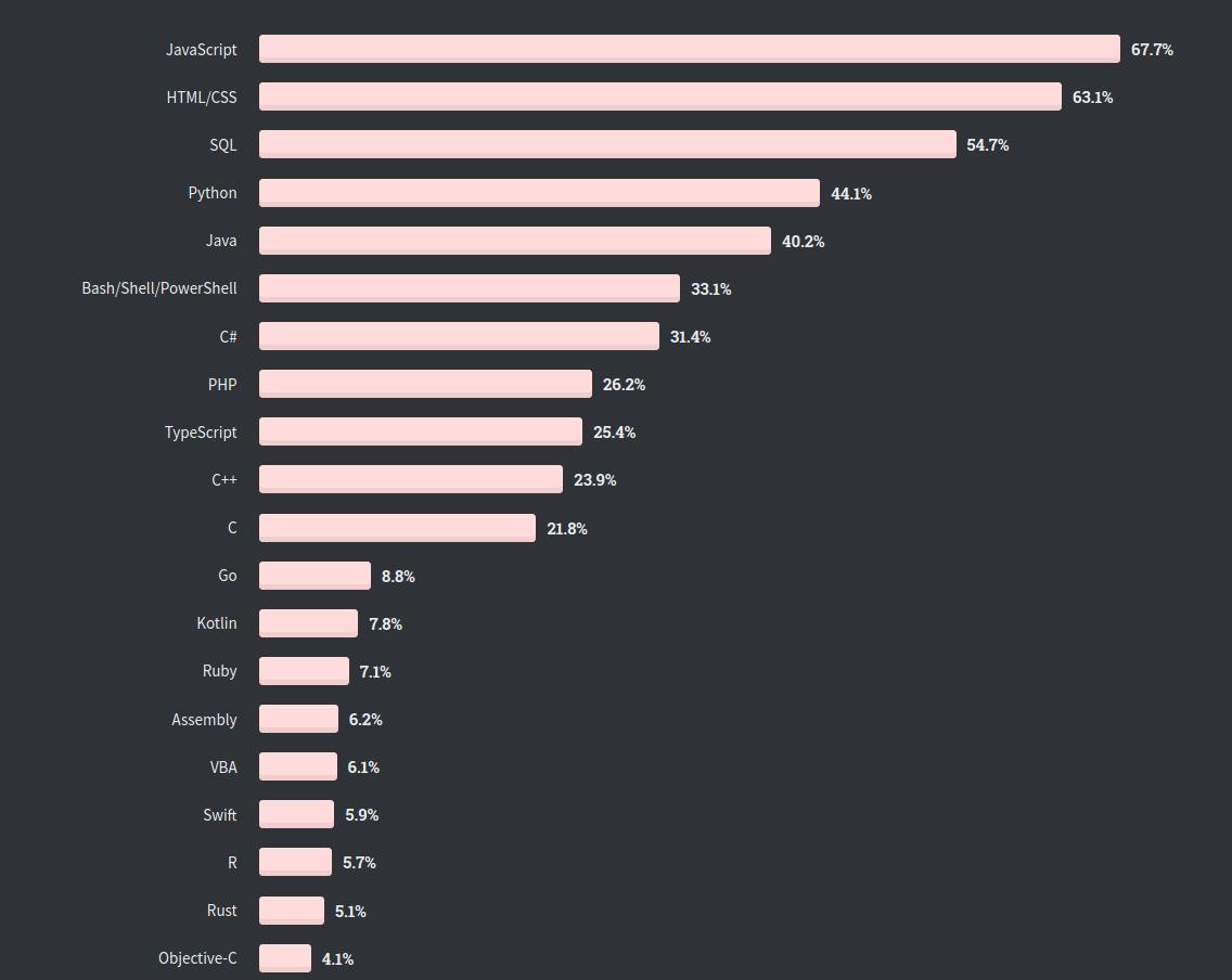 И последнее, но оттого не менее важное: давайте поговорим о чем-то нетехнического характера. Во-первых, давайте посмотрим на результаты опроса, которые отображают наиболее часто используемые языки программирования в 2020 году.