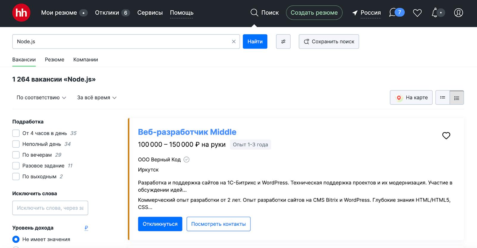 Хэдхантер при запросе Node.JS на июль 2024 года выдает 1264 вакансии. По уровню дохода они распределяются так: