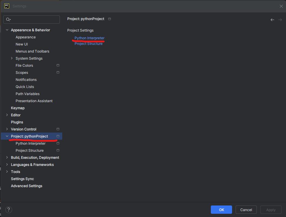 Найти меню Project: “ИмяПроекта” и нажать на Python Interpreter