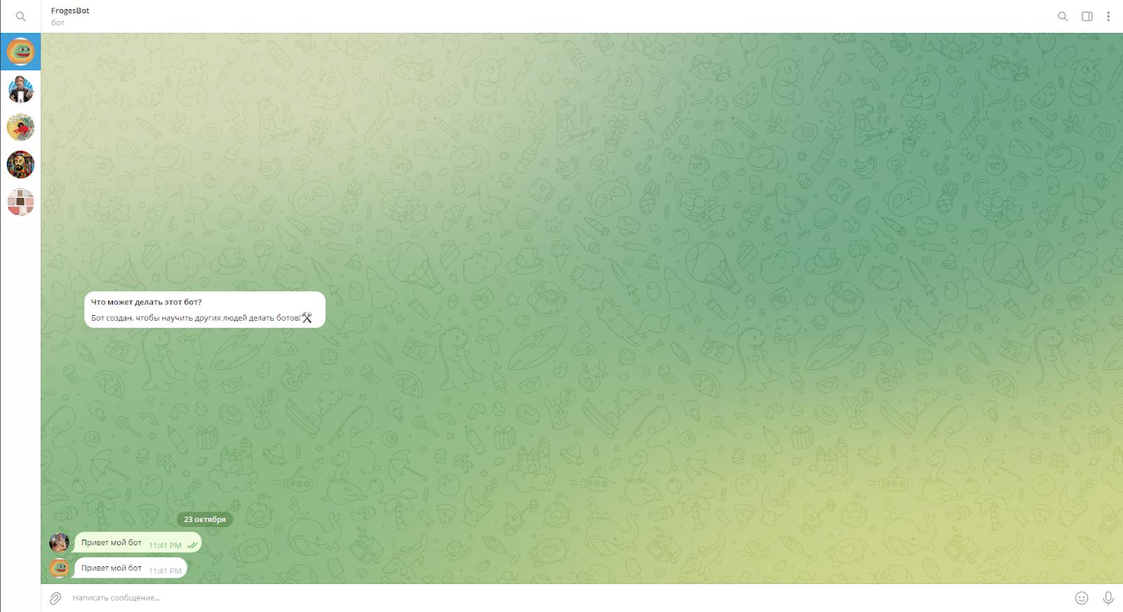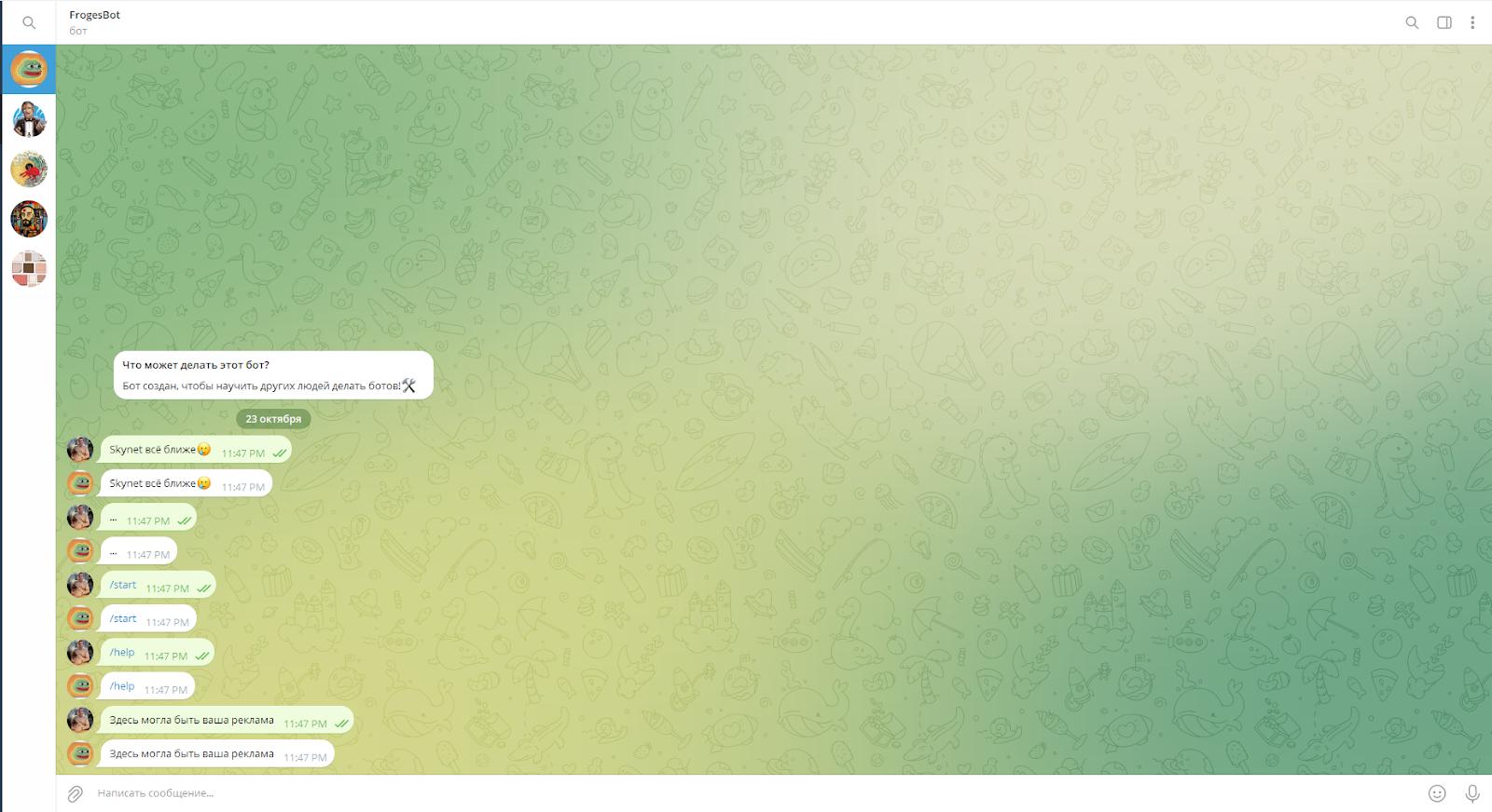 Видим, что при отправке сообщения, в ответ нам приходит тоже самое. Это и есть эхо бот!