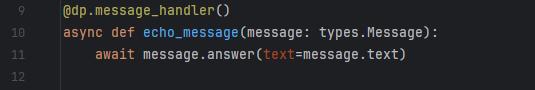 async def echo_message(message: types.Message): Функция должна принимать аргумент с аннотацией типов types.Message, чтобы мы могли взаимодействовать со входящей информацией от пользователя. Для ответа ботом на сообщения напишим конструкцию: