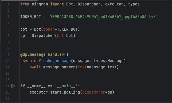 Используем конструкцию if __name__ == “__main__”: для запуска текущего файла напрямую. Это так называемая точка входа работы бота. Для запуска постоянного опроса входящих данных со стороны пользователя, используем операцию выполнения: executor.start_polling(dispatcher=dp). В качестве аргумента передаем нашего диспетчера.