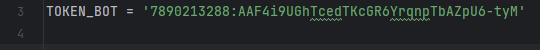- Создаём переменную и присваиваем ей значение токена бота (Токен это индивидуальный API ключ, который присваивается каждому боту и необходим для взаимодействия программы с ботом)