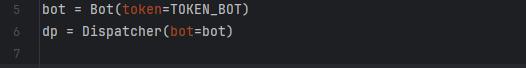 Создаём объекты бота и диспетчера. Объекту bot передается в качестве аргумента токен бота, а объекту dp в качестве аргумента передается объект bot.