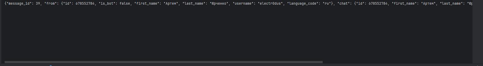 Пишем боту любое сообщение и в терминале получаем следующий вывод.
