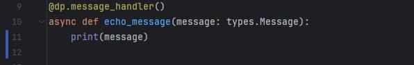 Делаем простенький хэндлер, как в прошлой статье про эхо бота, но вместо отправки сообщения нам обратно, выведем аргумент в терминал с помощью функции print().
