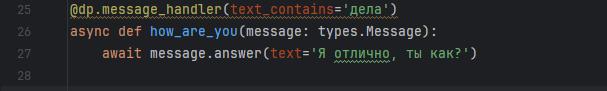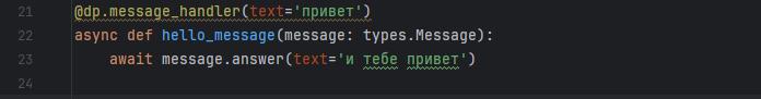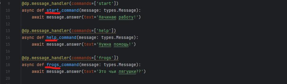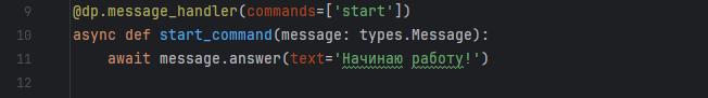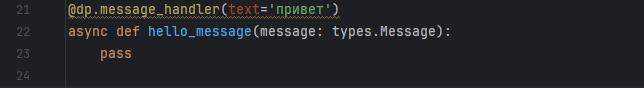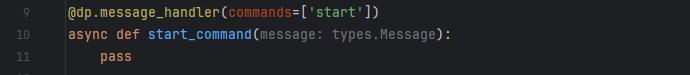 Также обязательно после декоратора создаём асинхронную (async) функцию (не забываем в качестве параметра передать наш message: types.Message), назвать её можно как угодно, но лучше дать имя, созвучное с обрабатываемой командой.