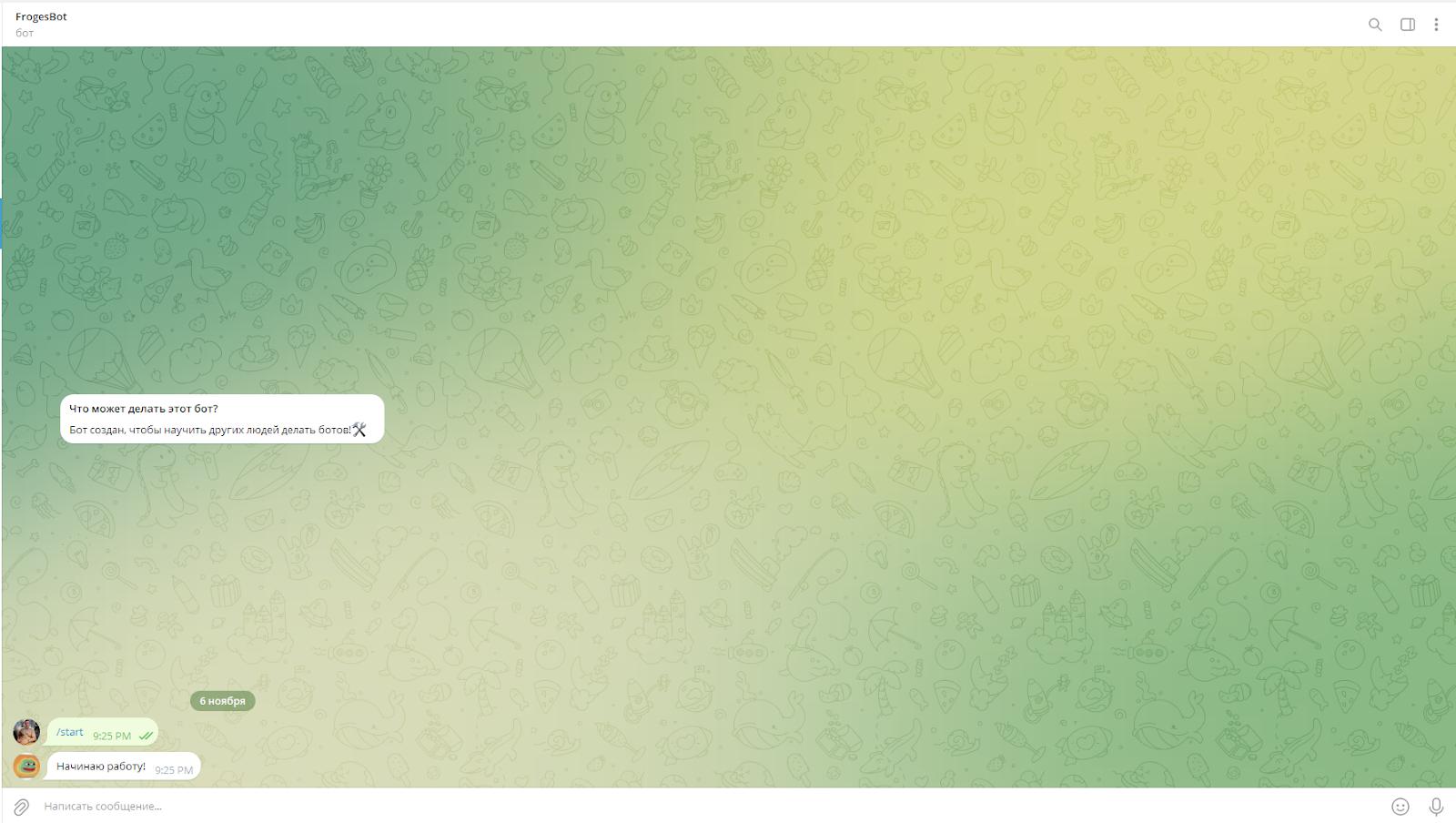 Напишем простейшую логику обработки. При получении команды start, бот будет отправлять сообщение пользователю, что он начал работу.