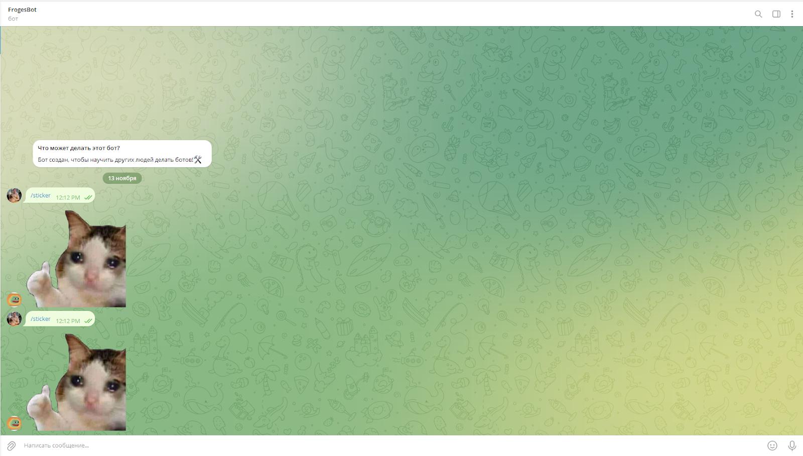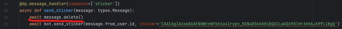 Теперь при отправке команды /sticker бот будет удалять её и отправлять нам стикер.