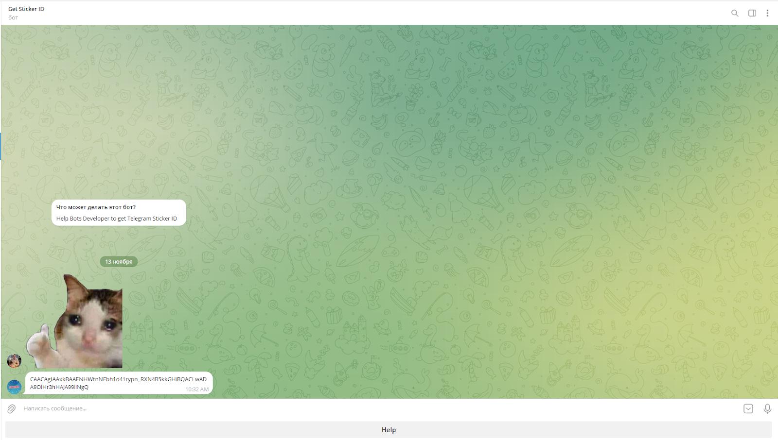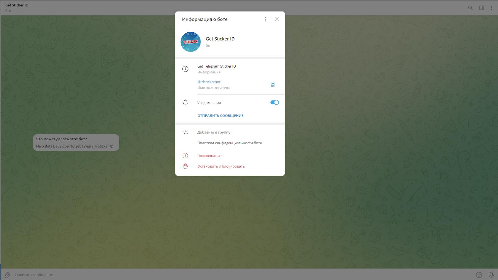 Для получения кода необходимо в диалог боту отправить стикер, код которого мы хотим узнать.