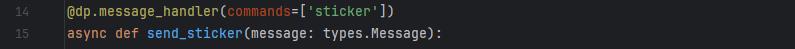 Напишем хендлер, который будет обрабатываться при получении команды /sticker и отправлять стикер пользователю.