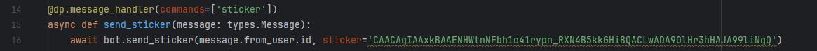 В параметрах к методу указываем id пользователя, который получит данный стикер (message.from_user.id), в нашем случае это тот, кто и отправил команду /sticker и код стикера.