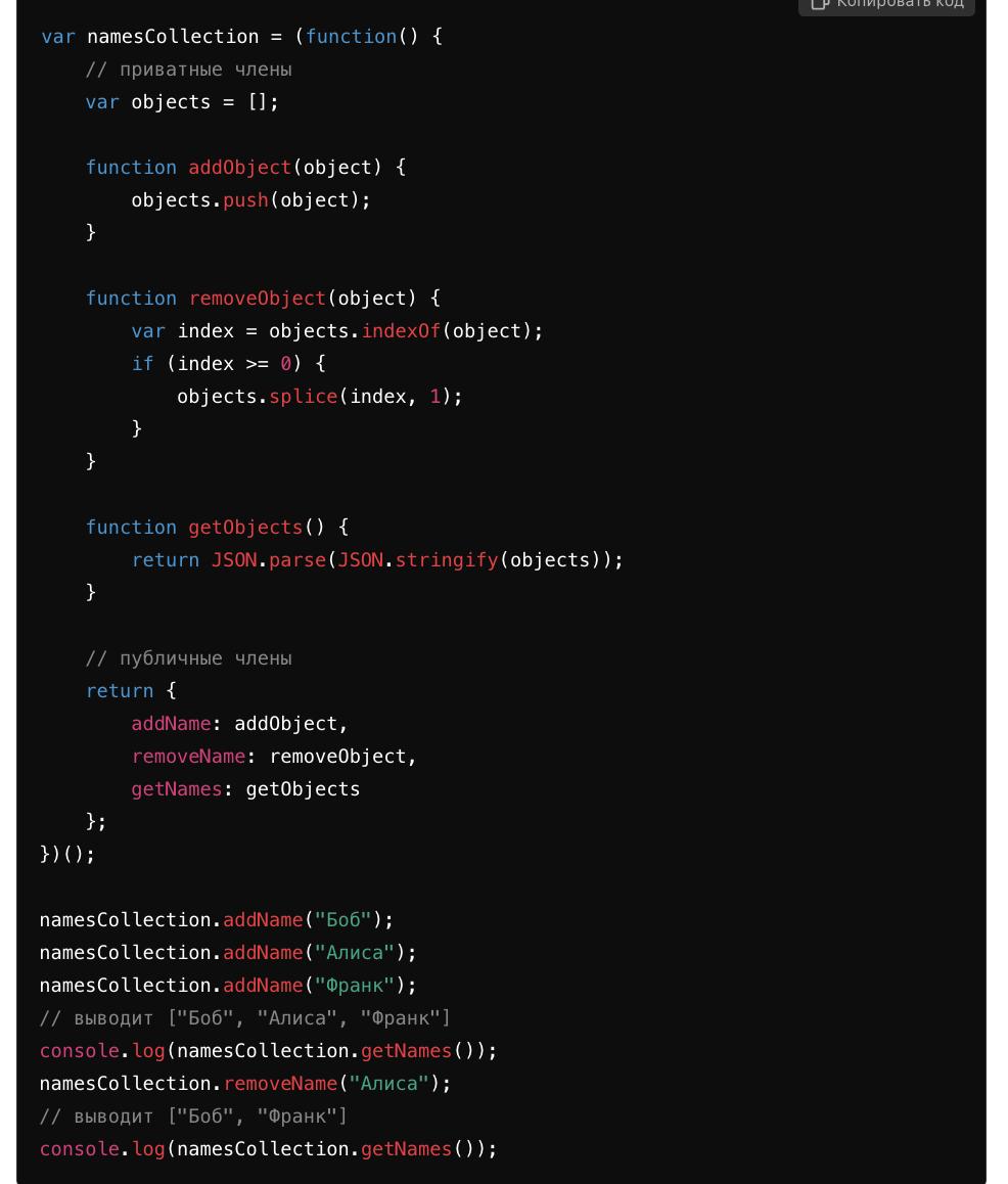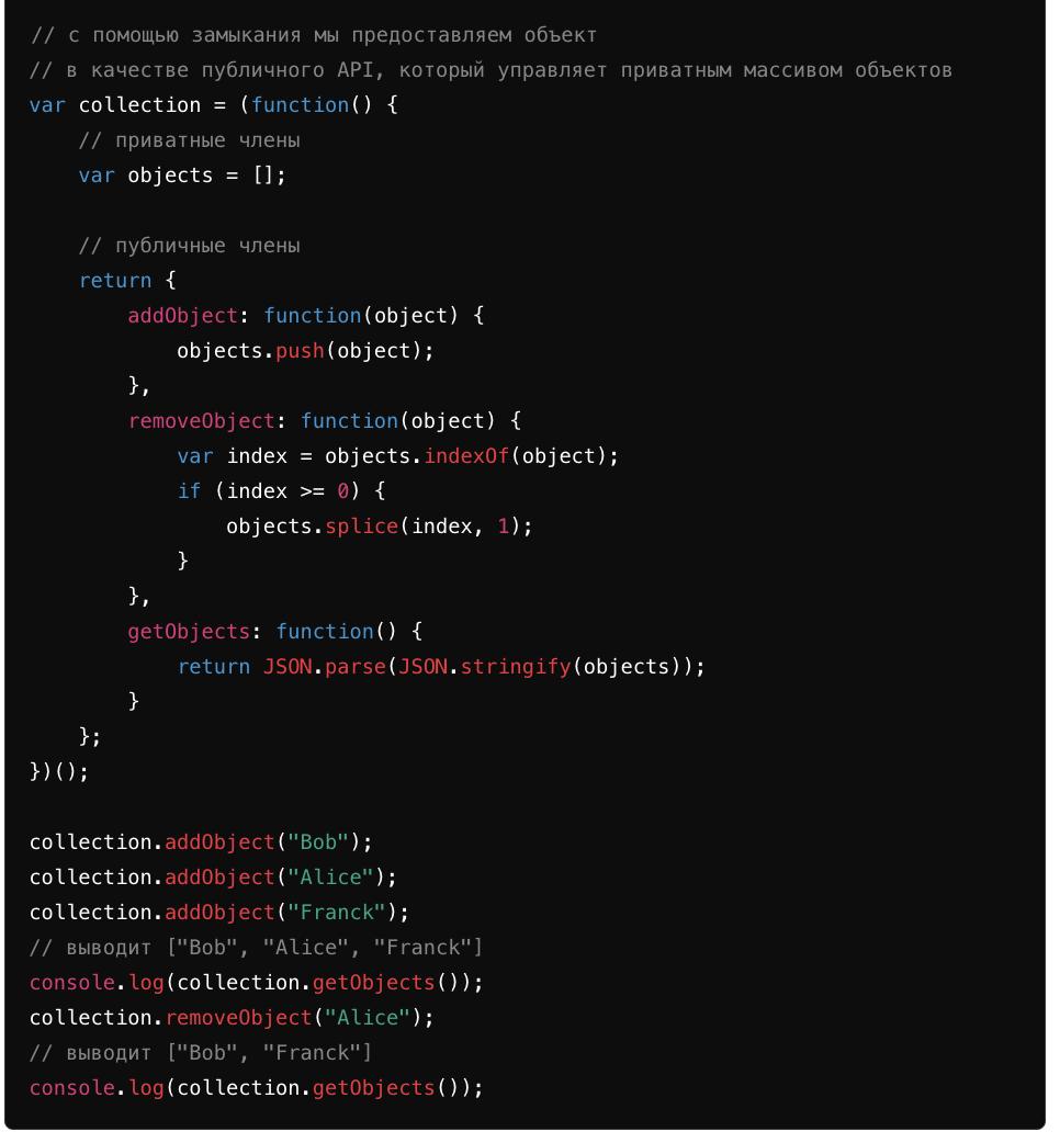Используя замыкания, мы можем создавать объекты с приватными и публичными частями. Эти объекты называются модулями и очень полезны, когда мы хотим скрыть некоторые части объекта и открыть только интерфейс для его использования. Покажем это на примере: