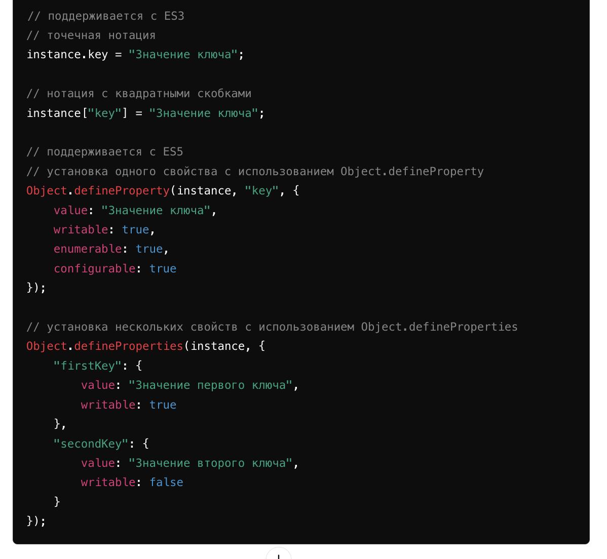 После создания объекта существует четыре способа (начиная с ES3) добавить свойства в эти объекты. Вот они: