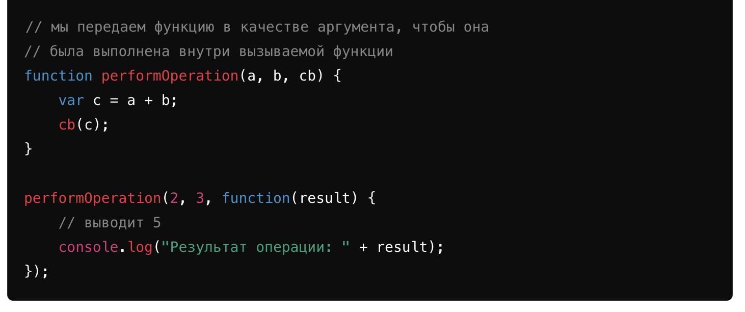 Это означает, что вы можете передавать функции в качестве параметров другим функциям точно так же, как и любую другую переменную. Этот код складывает два числа, а затем передает результат в колбэк-функцию, которая выводит его в консоль.
