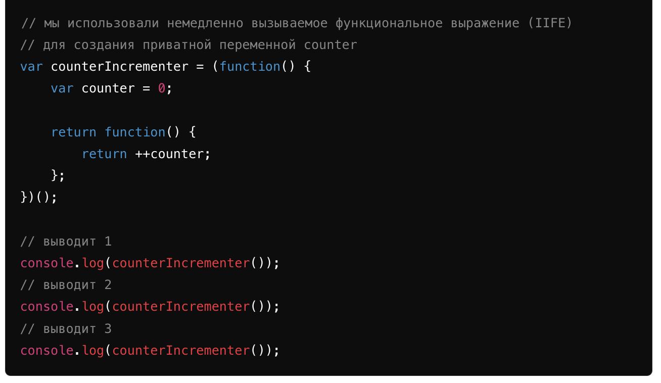 Как видите, с помощью IIFE (немедленно вызываемого функционального выражения) мы привязали переменную counter к функции, которая была вызвана и завершилась, но по-прежнему доступна дочерней функции, которая её увеличивает. Так как мы не можем получить доступ к переменной counter извне функционального выражения, мы сделали её приватной через манипуляцию с областью видимости.