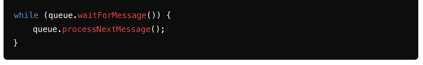 queue.waitForMessage() синхронно ожидает новые сообщения. Каждое обрабатываемое сообщение имеет свой собственный стек и обрабатывается до тех пор, пока стек не опустеет. Когда выполнение завершено, из очереди берется новое сообщение, если оно есть.