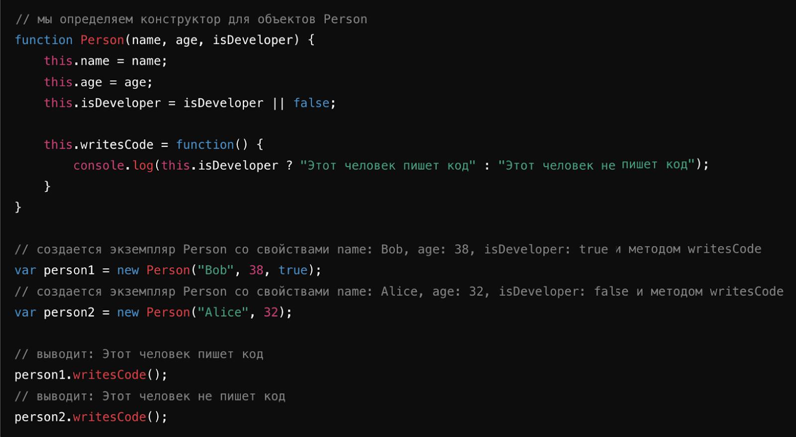 Теперь оба экземпляра конструктора Person могут получить доступ к общей версии метода writesCode().