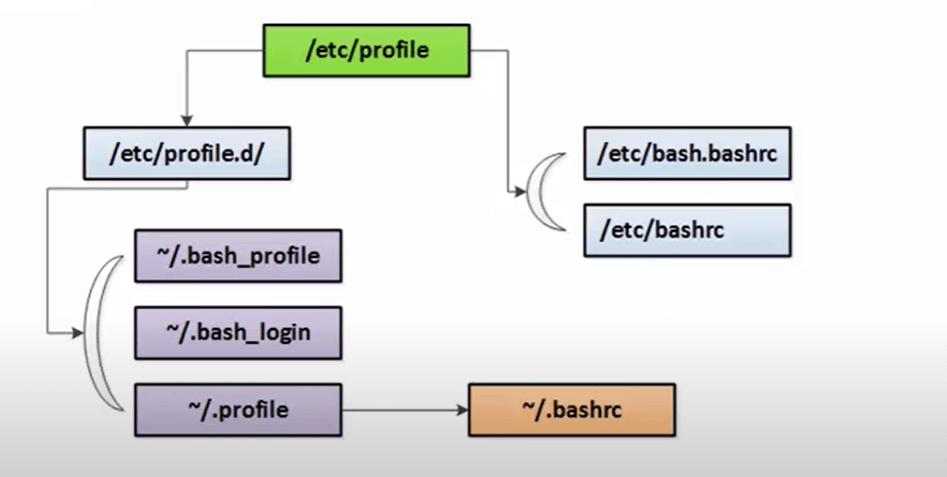 Существует папка /etc/profile в ней лежат настройки глобального профиля. Такой профиль, который будет применяться для всех пользователей на данной машине, которые запускают командную оболочку. Функционал у него достаточно большой, но в первую очередь он грузит все что есть в /etc/profile.d и настройки глобального пользователя /etc/bash.bashrc и /etc/bashrc. Получается так, что ищется файл bash.bashrc или bashrc файлы, т.к в разных дистрибутивах разные файлы и грузит то, что он нашел. В документации по Linux написано, если запускается инициализационный скрипт при входе в систему, т.е пользователь заходит в систему, то отрабатывает левая часть картинки, если запускается оболочка вне контекста пользователя, то правая часть.