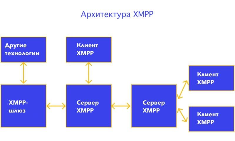 Вся обработка XMPP основана на архитектуре "клиент-сервер", где сообщения сначала передаются на сервер, а затем клиентам.