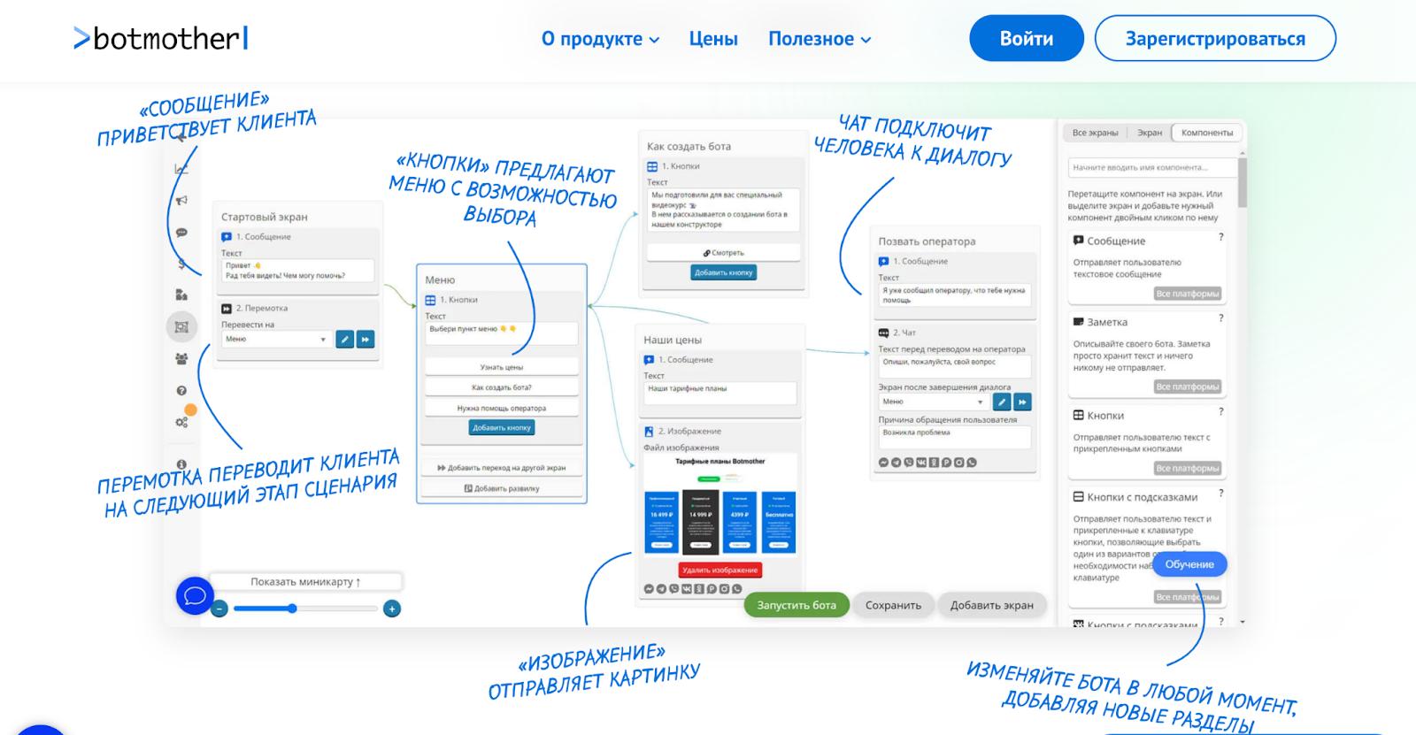 Здесь создаются боты для Telegram, WhatsApp, Viber и другие. Платформа предлагает готовые шаблоны и инструменты для быстрого запуска ботов с различными функциями: от автоматических ответов до управления заказами и проведения опросов. Для создания алгоритмов необходимо выбирать и передвигать смысловые блоки. Бота можно интегрировать с CRM-системой для бронирования или покупок.