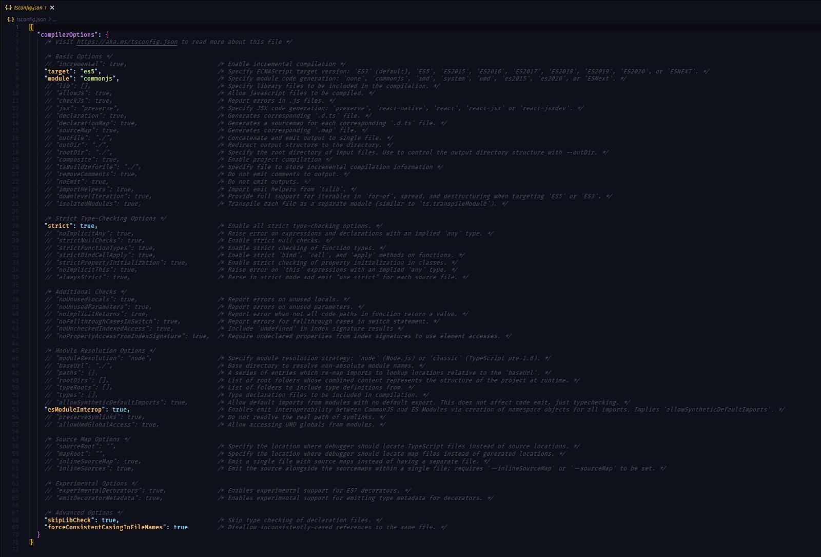 Эта команда откроет в корневом каталоге проекта новый файл tsconfig.json. В этом файле конфигурации содержатся все параметры конфигурации, которые мы можем использовать в TypeScript-проекте.