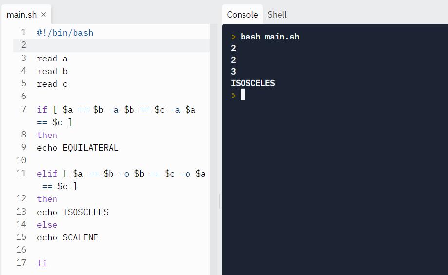 elif [ $a == $b -o $b == $c -o $a == $c ]