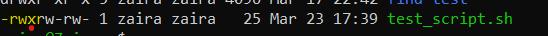 Право исполнения обозначается символом x. В примере ниже мой пользователь имеет права rwx (read, write, execute – чтение, запись, выполнение) для файла test_script.sh.