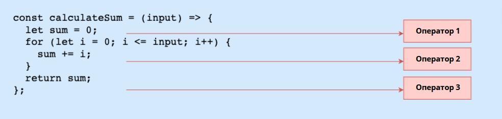 Давайте посмотрим на картинку выше. У нас есть три оператора. При этом, так как у нас есть цикл, то второй оператор будет выполняться, основываясь на размере входных данных, поэтому, если на входе алгоритм получает 4, то второй оператор будет выполняться четыре раза. А значит, в целом алгоритм выполнится шесть (4+2) раз.